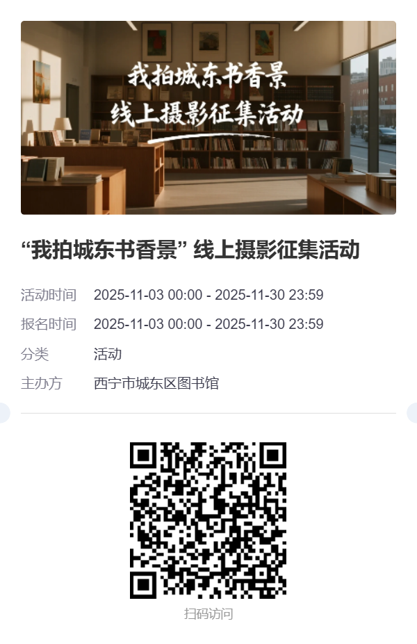 城东区深耕 “书香城东” 建设,图书馆、社区书屋、城市书房已成为居民精神栖息地,家庭阅读角更藏着无数温馨日常。本次摄影征集以 “镜头捕书香,光影传温情” 为核心,鼓励读者用影像记录城东阅读场景的细节之美、人文之暖,让更多人看见阅读融入生活的生动模样,进一步浓厚区域阅读文化氛围。