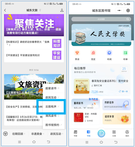 1.城东文旅的微信公众号里找到《政民互动》里版块里的《云图有声》,成功找到哪吒等相关的推荐书本资源,并现场听书;